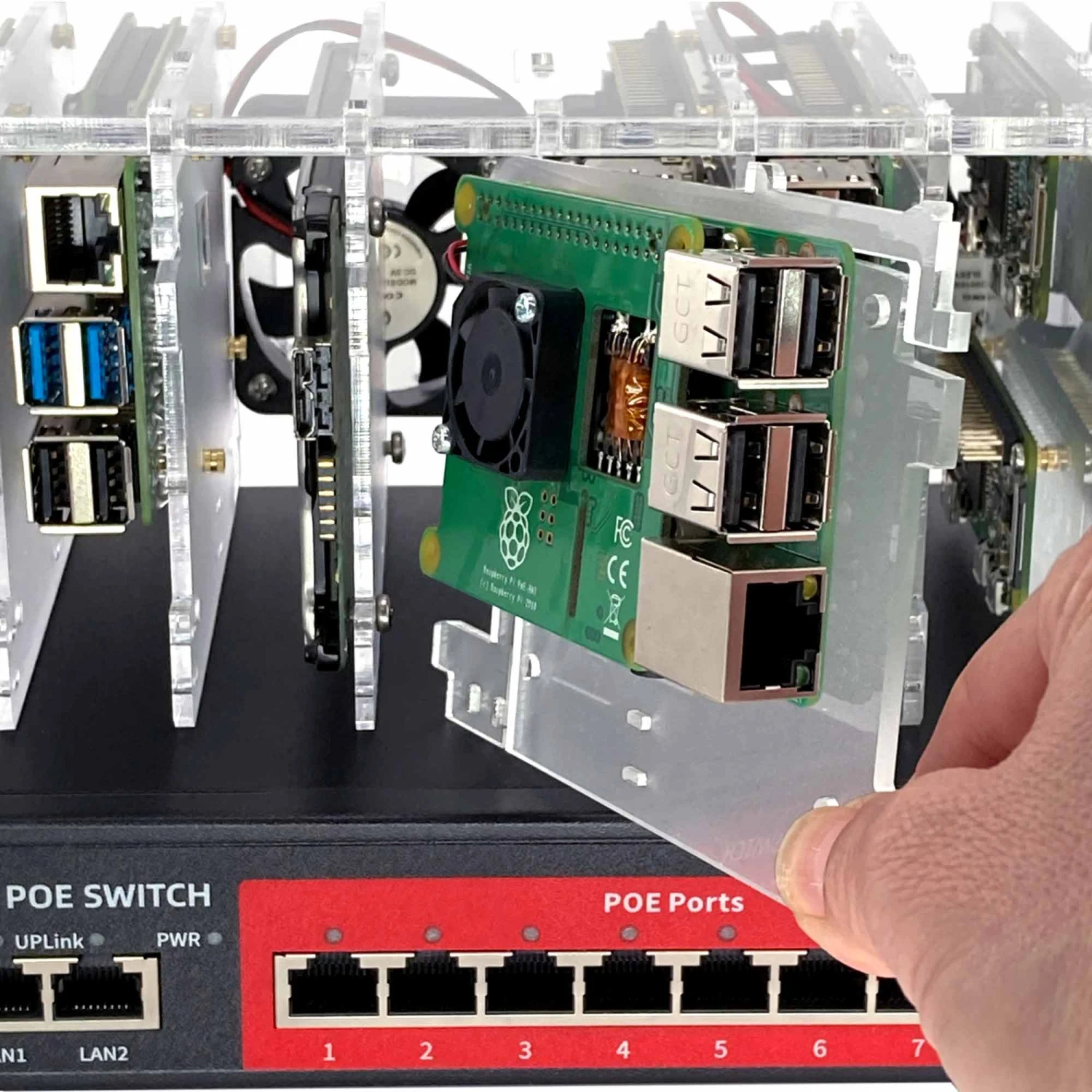 will allow you to neatly house up to EIGHT Raspberry Pi boards as well as a network switch!