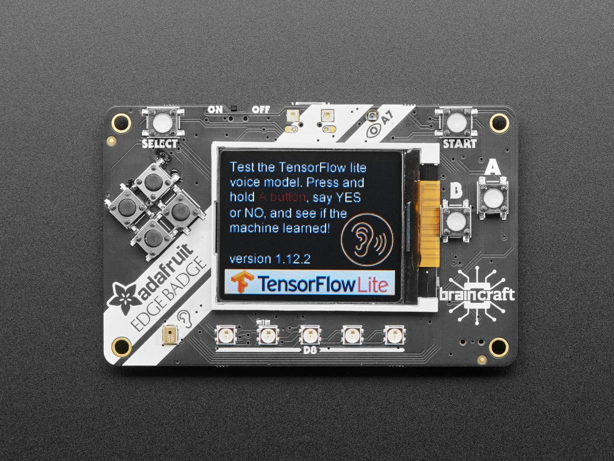 But you don’t need super complex hardware to start developing your own TensorFlow models! We’ve adapted our popular PyBadge board to add a microphone so you can dip your toes into machine learning waters. It does everything that the PyBadge does, and as we make more projects that use Machine Learning we’ll adapt this board to make it better and better for machine learning.