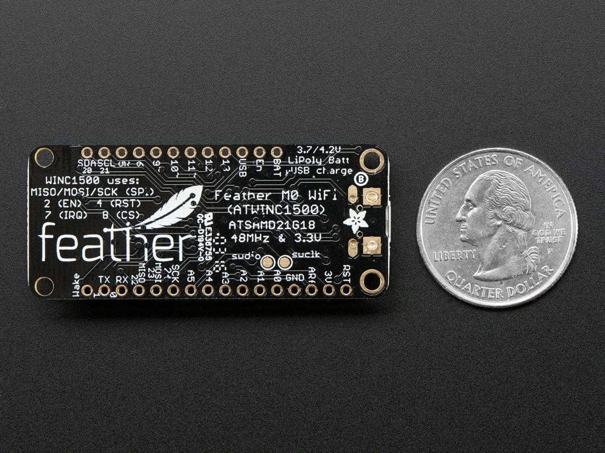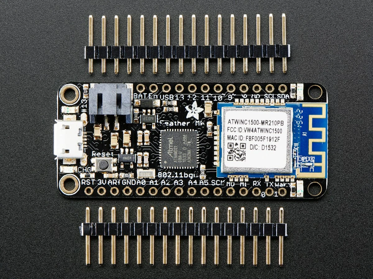 Feather is the new development board from Adafruit, and like its namesake it is thin, light, and lets you fly! We designed Feather to be a new standard for portable microcontroller cores. This is the Adafruit Feather M0 WiFi w/ATWINC1500 – our take on an ‘all-in-one’ Arduino-compatible + high speed, reliable WiFi with built in USB and battery charging. Its an Adafruit Feather M0