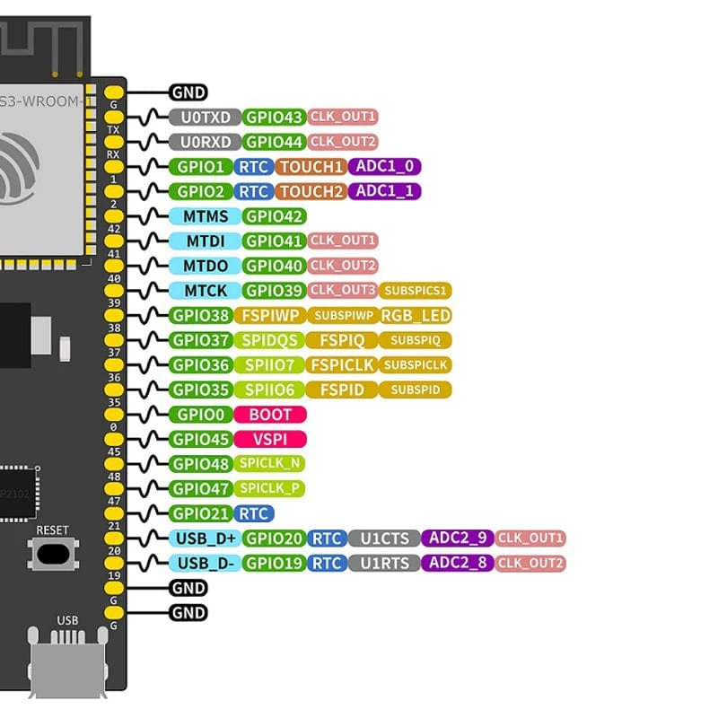 The ESP32-S3-DevKitC-1 is an entry-level development board equipped with ESP32-S3-WROOM-1, ESP32-S3-WROOM-1U, or ESP32-S3-WROOM-2, a general-purpose Wi-Fi + Bluetooth® LE MCU module that integrates complete Wi-Fi and Bluetooth LE functions.
