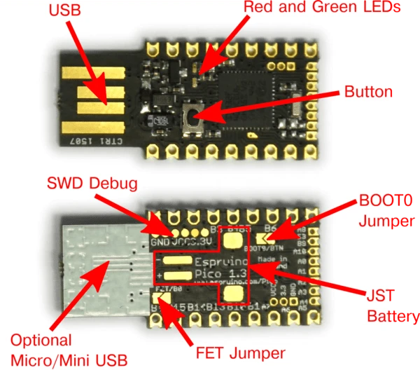 While the main advantage of the Espruino is its instant execution, it can also be used as a traditional board through a Web-based IDE hosted on your computer. The microcontroller also uses less power than Linux Boards (although its of course a lot less powerful as well) so will run longer on battery power, it has loads of IO pins, and it can be used as an IO board for PCs, Macs, or Rasp Pis without having to program it first. Simply take the Espruino out of its packaging and get started! There’s also much more info on the Espruino Pico page including tutorials, code examples, manuals, datasheets, and more!