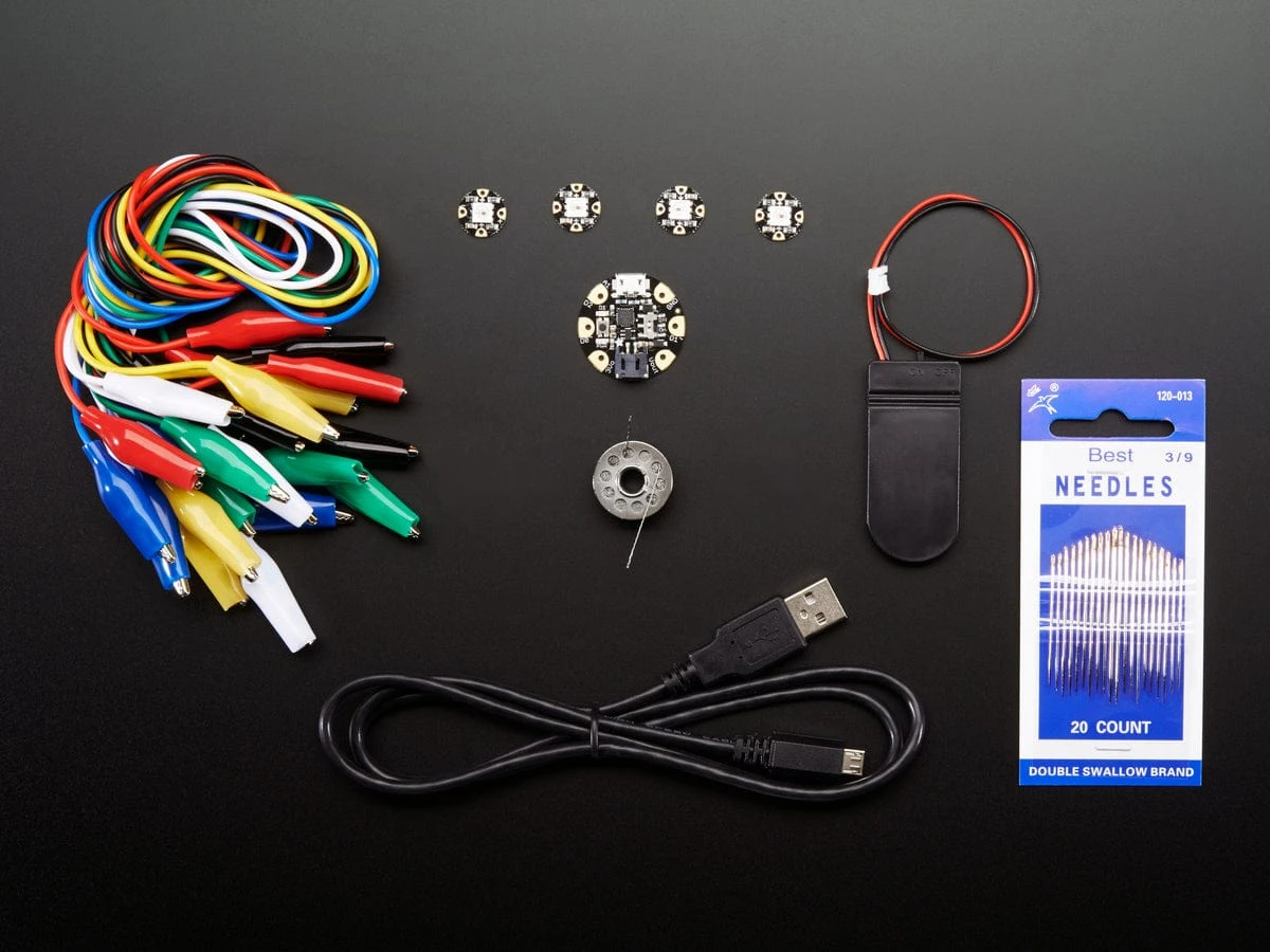 Get started with Adafruit GEMMA with this lovely starter kit! Included is everything you need to make a basic project. There’s a GEMMA board, four sewable bright RGB pixels, a battery holder and batteries, 2-ply conductive thread, alligator clips to help you test out your circuit, and a USB cable for programming GEMMA.
