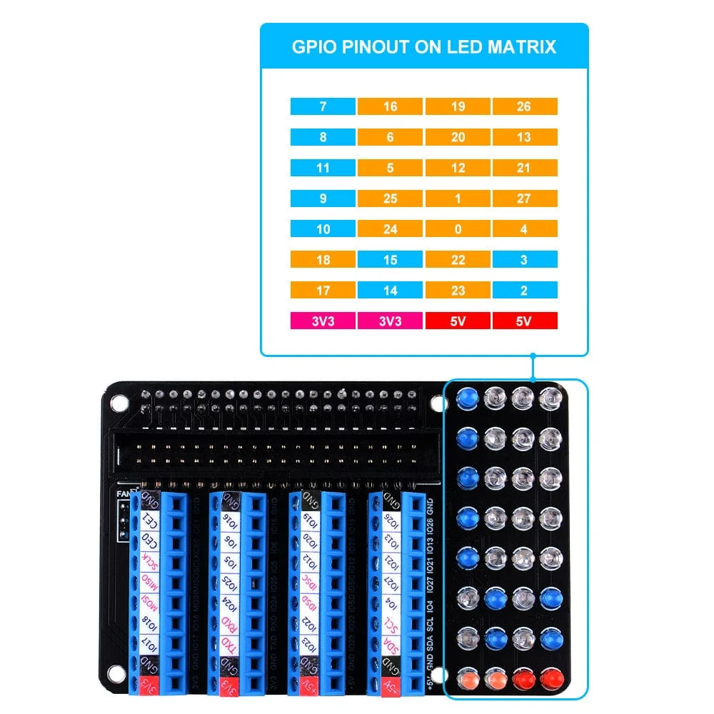 The included add-on board offers secure, well-labelled screw terminal connections for your Raspberry Pi’s GPIO pins, whilst also providing colour-coded LED indication of the GPIO status (including 3.3V, 5V and GPIO).