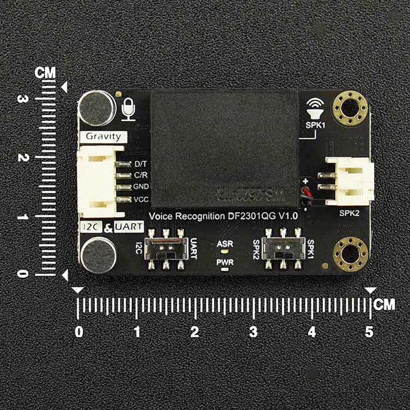 The module features a dual microphone design with noise resistance and a longer recognition distance, making it accurate and reliable even in noisy environments. It comes with a built-in speaker and an external speaker interface for real-time voice feedback of recognition results.