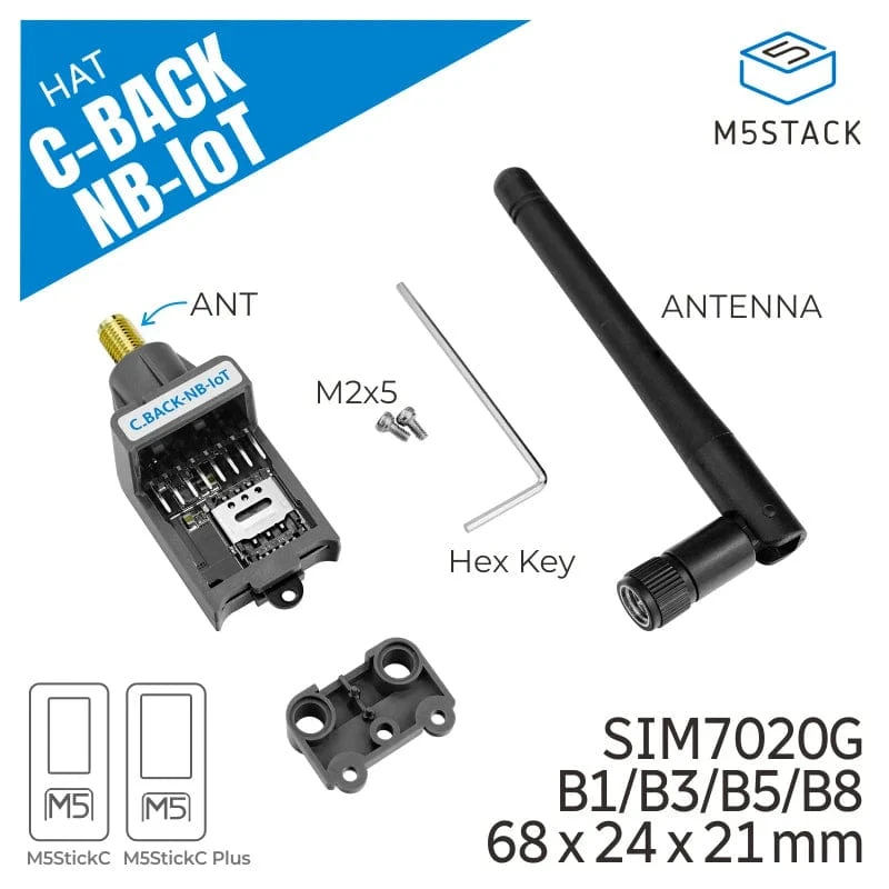 The CBack NB-IoT is an NB-IoT communication module adapted to the M5StickC/C Plus series, with a built-in SIM7020G module that covers most of the world’s Cat-NB frequency band. It integrates the SMA external antenna interface, improves the communication quality, and the signal stability of the device. It supports a variety of common IoT communication protocols (MQTT, HTTP, CoAP, etc.), which is suitable for various low-latency and low-throughput application scenarios.