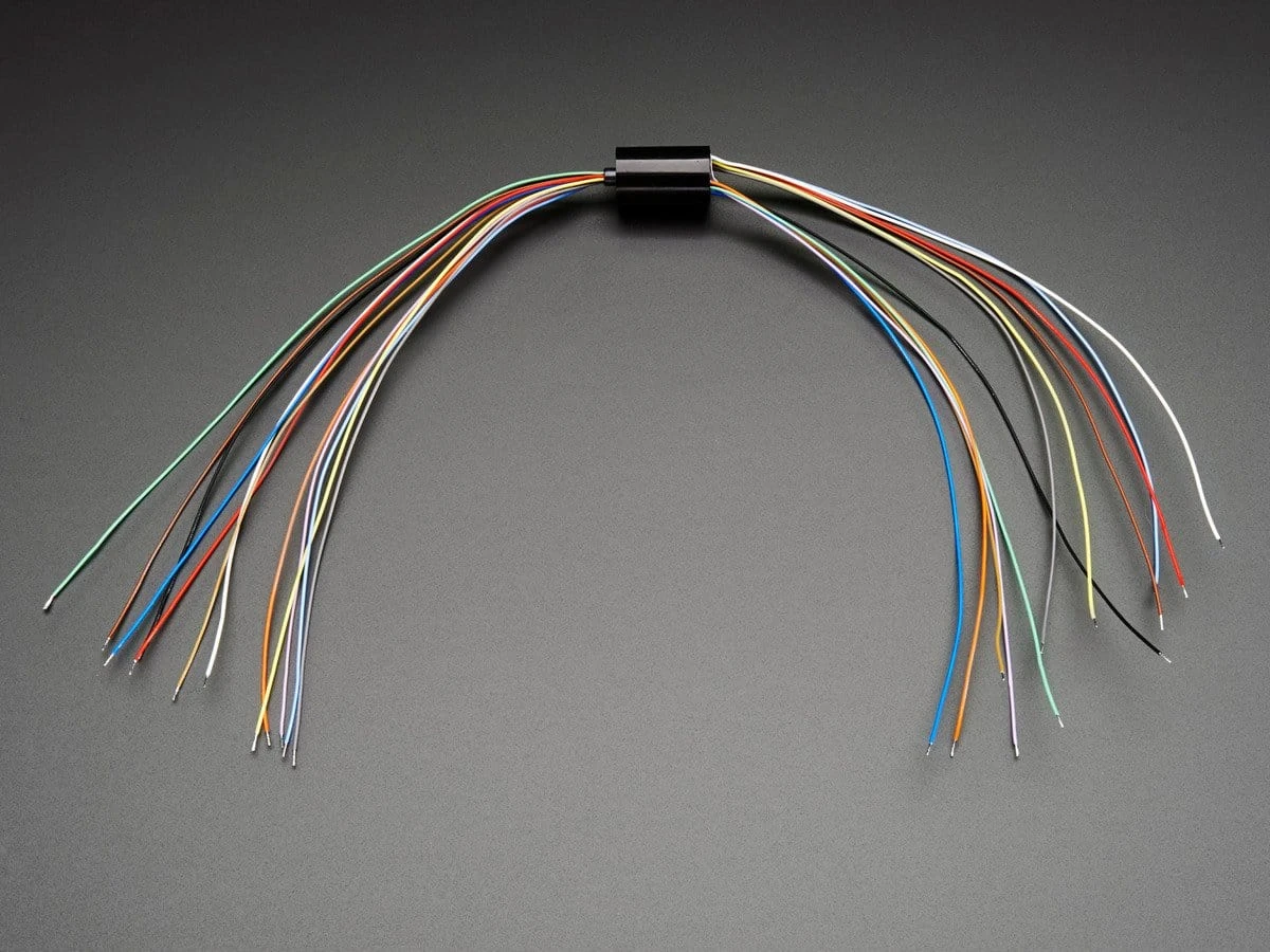 Inside the miniature plastic tube is a gold plated slip ring for 12 wires. There are twelve color coded wire sets made of 28 AWG and no matter how you twist the assembly, they will remain in continuity. Each of the wire sets can carry up to 2A at up to 240VAC or 240VDC. This model is the tiniest slip ring you can get, a mere 20mm long, 12mm diameter. Rated to rotate up to 300 RPM (but you can probably go faster if you don’t mind a reduced life and/or noise).