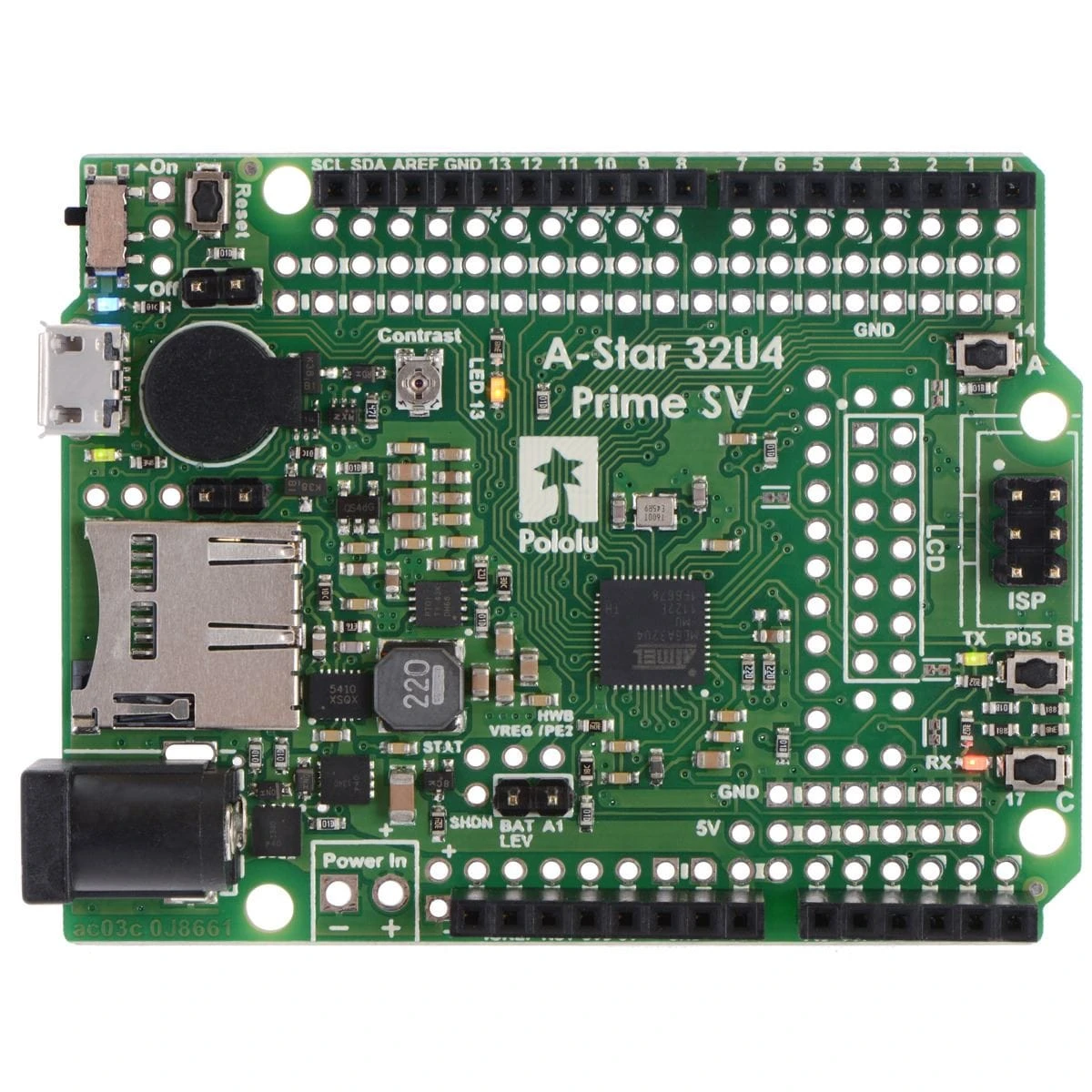 The Pololu A-Star 32U4 Prime is a general-purpose programmable board based on the ATmega32U4 AVR microcontroller from Microchip (formerly Atmel) and arranged in the common Arduino form factor exemplified by theÂ