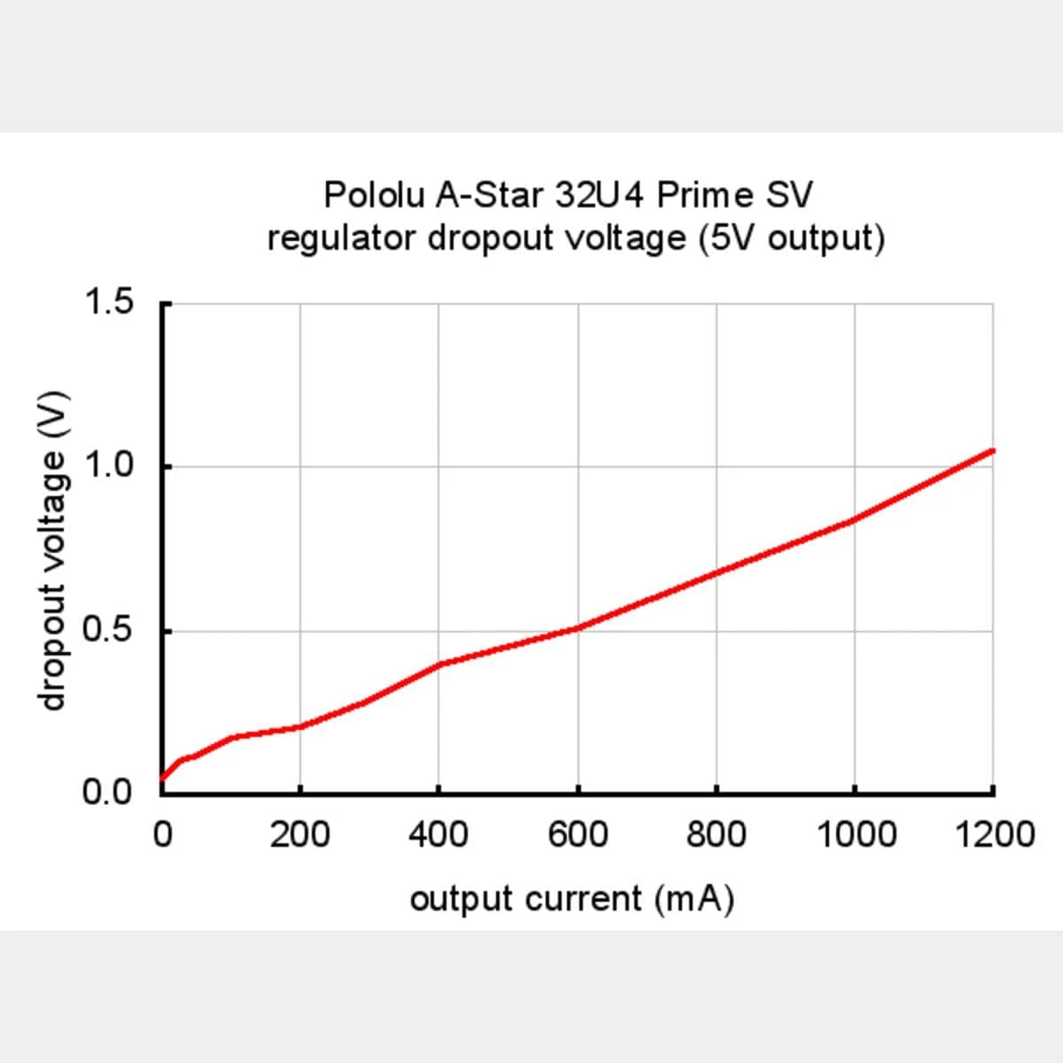 The dropout voltage of a step-down regulator is defined as the minimum amount by which the input voltage must exceed the regulator’s target output voltage in order to assure the target output can be achieved. As can be seen in the graph, the dropout voltage of the Prime SV’s regulator increases approximately linearly with the output current. For light loads where the dropout voltage is small, the board can operate down to 5 V. However, for larger loads, the dropout voltage should be taken into consideration when selecting a power supply; operating above 6 V will ensure the full output current is available.