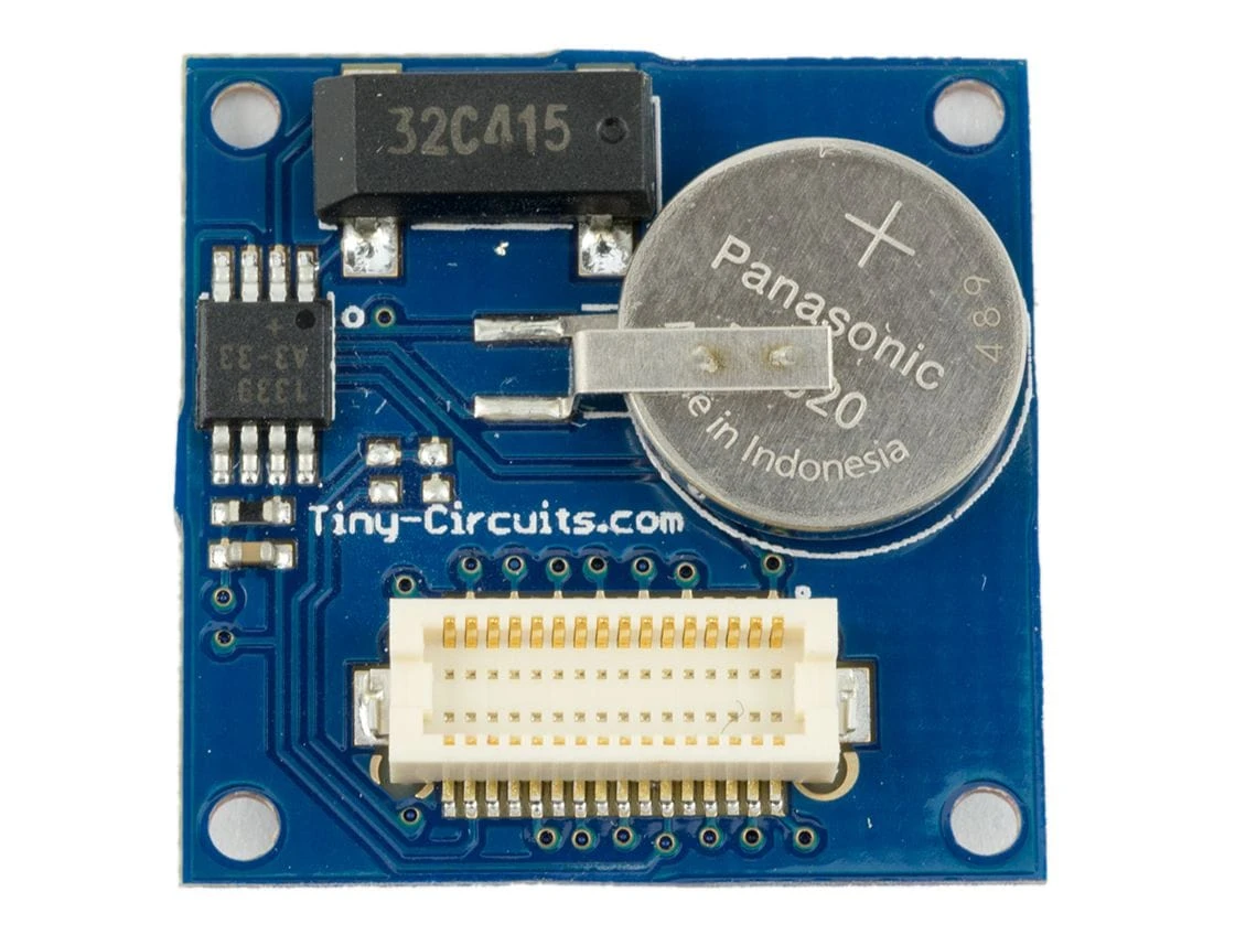 The RTC has two time-of-day alarms that can be set to wake up the main TinyDuino processor from sleep (very useful in long term data logging applications) and will automatically switch to using the backup battery upon power loss.
