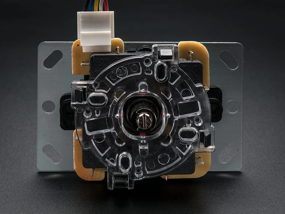 This snappy 8-way joystick beckons you to play with it! It is rugged, and not too large, reminiscent of a Pac Man arcade cabinet. Unlike the potentiometer-based 2-axis and mini thumbsticks, this joystick uses 4 snap microswitches so it’s good if you want a directional control but not the best choice if you want proportional output (that is, its either on/off not sensitive to small movement changes).
