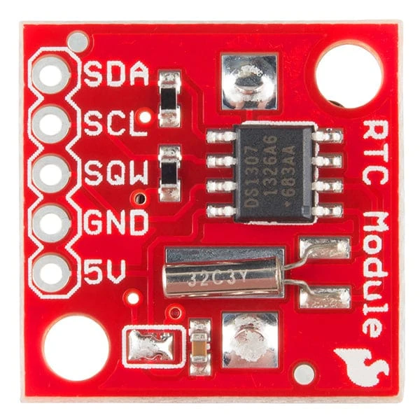 This is the SparkFun Real Time Clock (RTC) Module, this little breakout that uses the DS1307 to keep track of the current year, month, day as well as the current time. The module comes fully assembled and includes a small CR1225 Lithium coin cell battery that will run the RTC for a minimum of 9 years (17 years typical) without an external 5V power supply.