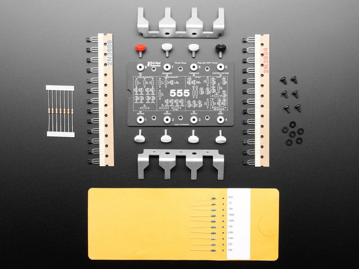 The Three Fives kit was designed by Eric Schlaepfer, in collaboration with Evil Mad Scientist Laboratories. The kit is lovingly designed to resemble an (overgrown) integrated circuit, based around an extra-thick matte-finish printed circuit board. It comes complete with a tough and sturdy plastic stand that gives the circuit board eight legs in the shape of DIP-packaged integrated circuit pins.